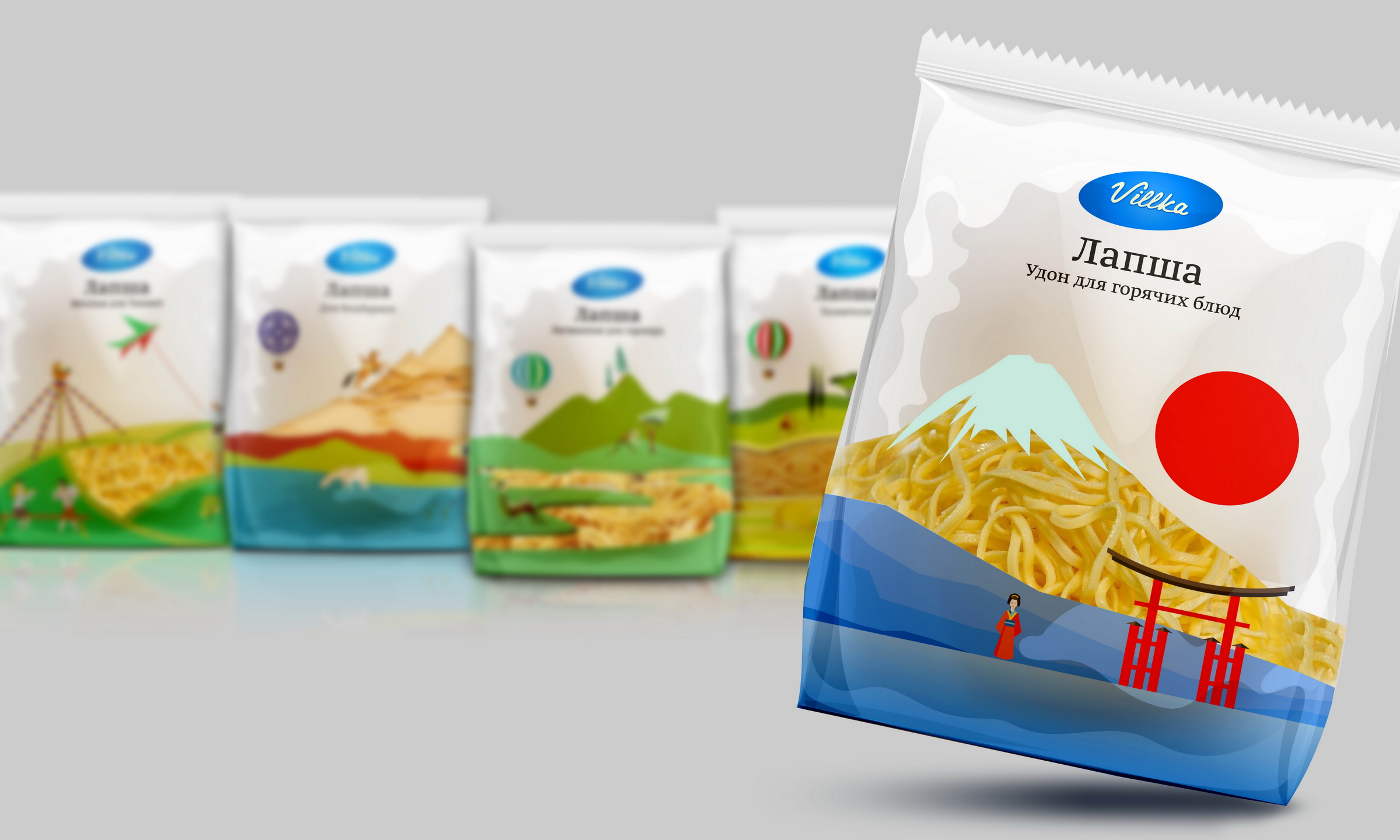 Лапша широко используется народами мира для приготовления национальных блюд — это и стало главным лейтмотивом визуальной идентификации. Такое решение позволяет потребителю быть ближе к традициям различных народов, почувствовать их дух, чтобы блюдо получалось «настоящим». Легкий позитив в дизайне притягивает к себе и вдохновляет на новые кулинарные свершения.