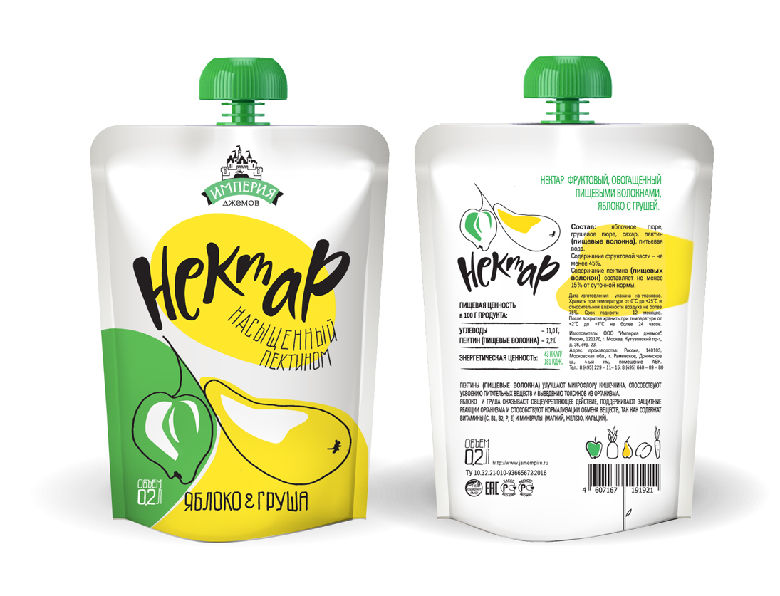 Игривая стилистика упаковки (немного легкомысленное начертание названия продукта, рукописные шрифты, солнечная капелька нектара в центре композиции) нацелена на поднятие настроения людям, работающим на вредных производствах. Вместе с таким искрящимся нектаром перерыв на обед будет веселее.