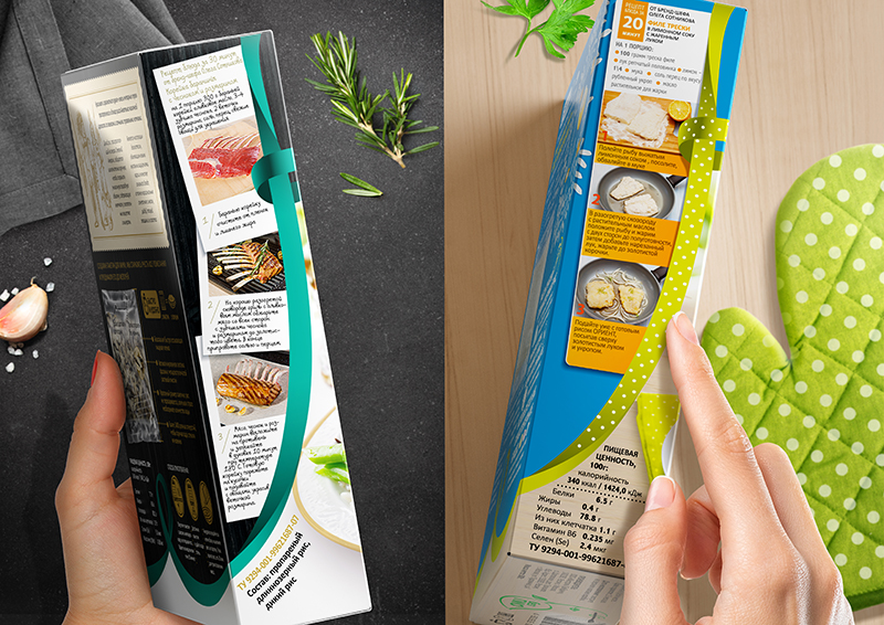 Главный акцент упаковки был сделан на «готовом продукте» — ресторанная подача и «вид сверху» были изменены на более привычные потребителям ракурсы. Оборотная сторона насыщена инфографикой, что дополнительно увеличивает время контакта потребителя с упаковкой и вызывает доверие к производителю.