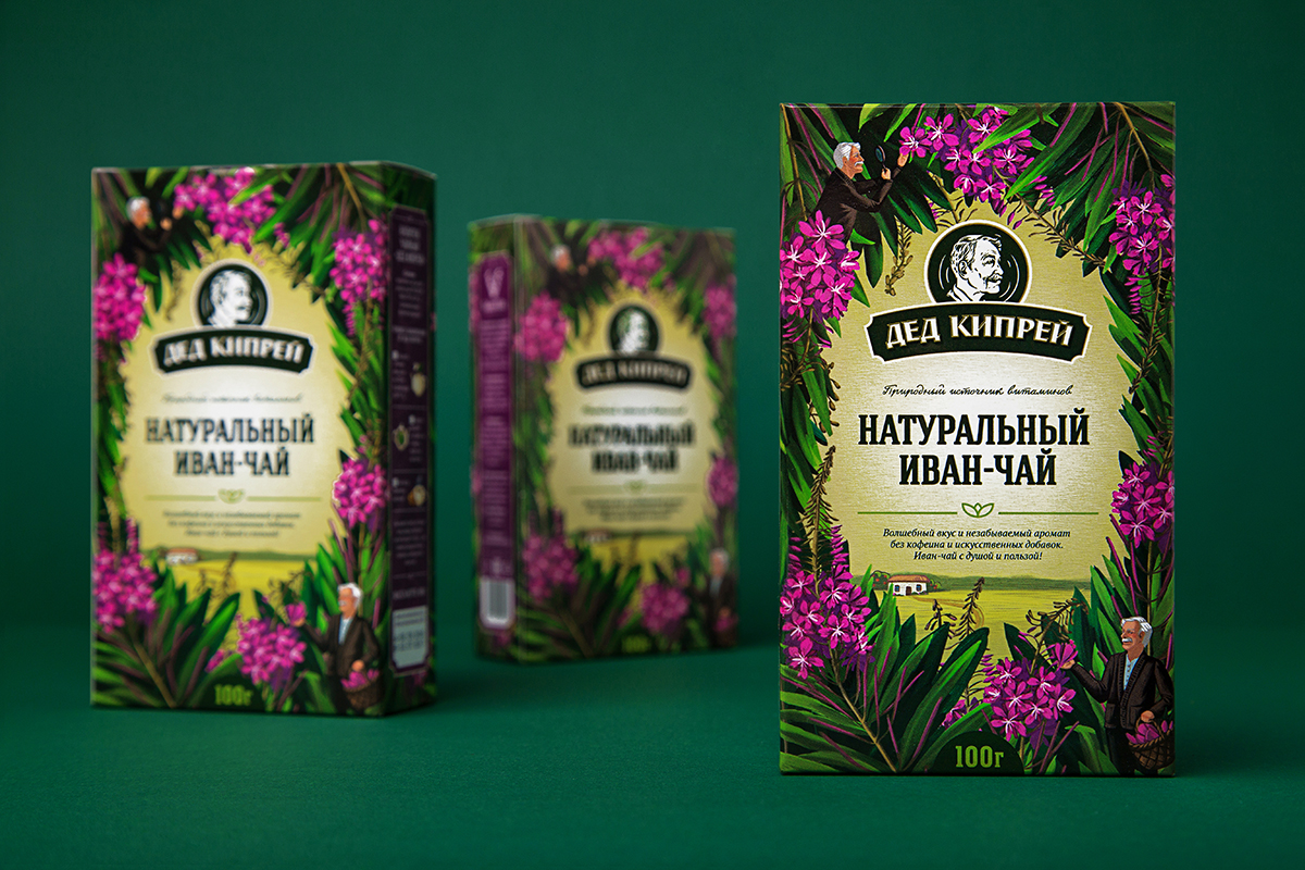 Дизайн-концепция, основанная на авторской иллюстрации с имитацией масляной живописи, развивает бренд-легенду, в которой дед Кипрей изучает растения иван-чая и собирает лучшие образцы. Упаковка рассказывает о целебности, богатой истории напитка, а также о тщательном подходе к отбору сырья производителем.