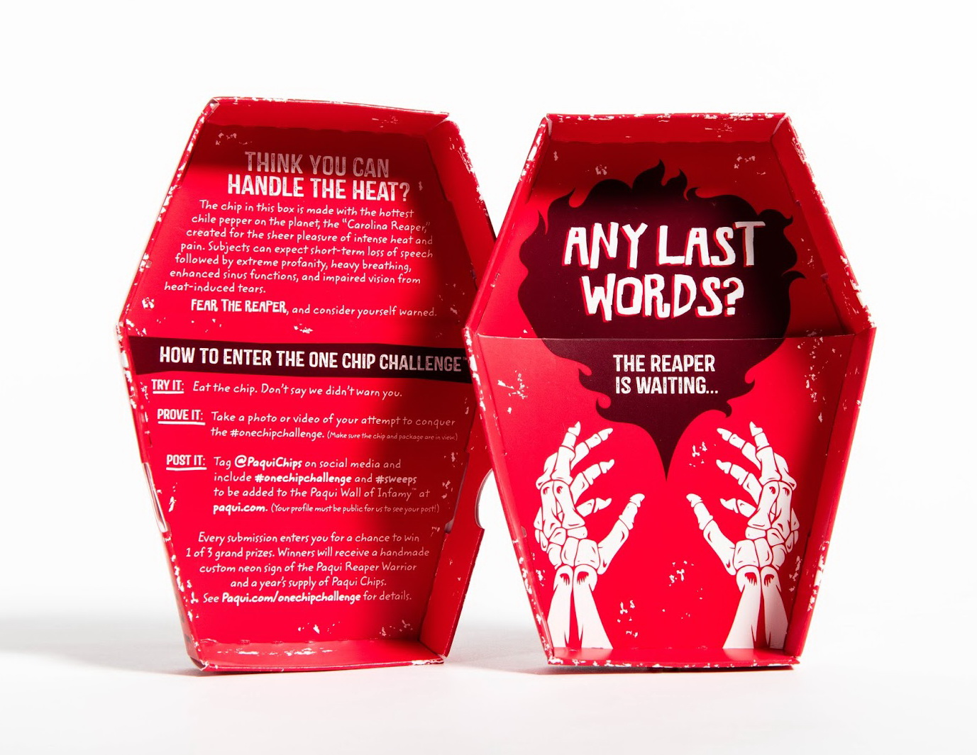 Техасская компания Paqui в этом году снова выпускает на рынок самый острый чипс Carolina Reaper Madness, который изготовлен с использованием знаменитого перца Carolina Reaper. Каждый чипс продаётся в индивидуальной упаковке, разработанной дизайнером Эрин Лидер (Erin Leeder). Упаковка была создана так, чтобы передать ощущение жгучести и предвкушения, а пакет с одним чипсом помещен в коробку в форме гроба, что позволяет защитить хрупкий продукт и предупредить потребителя о рисках.
