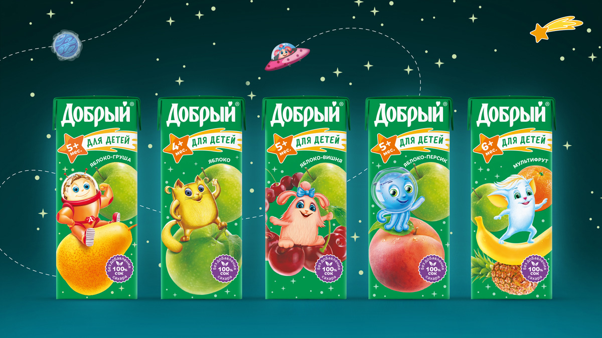 Обновленные образы героев «Добрый» стали более понятными маленьким потребителям. Каждая упаковка стала носителем и визуализацией маленькой истории о каждом инопланетном персонаже и его характере. На боковинах «Добрый» 0,2 л появились советы, призванные помочь родителям в увлекательной форме рассказать о ценностях доброты, а маленьких потребителей вдохновить на добрые поступки.