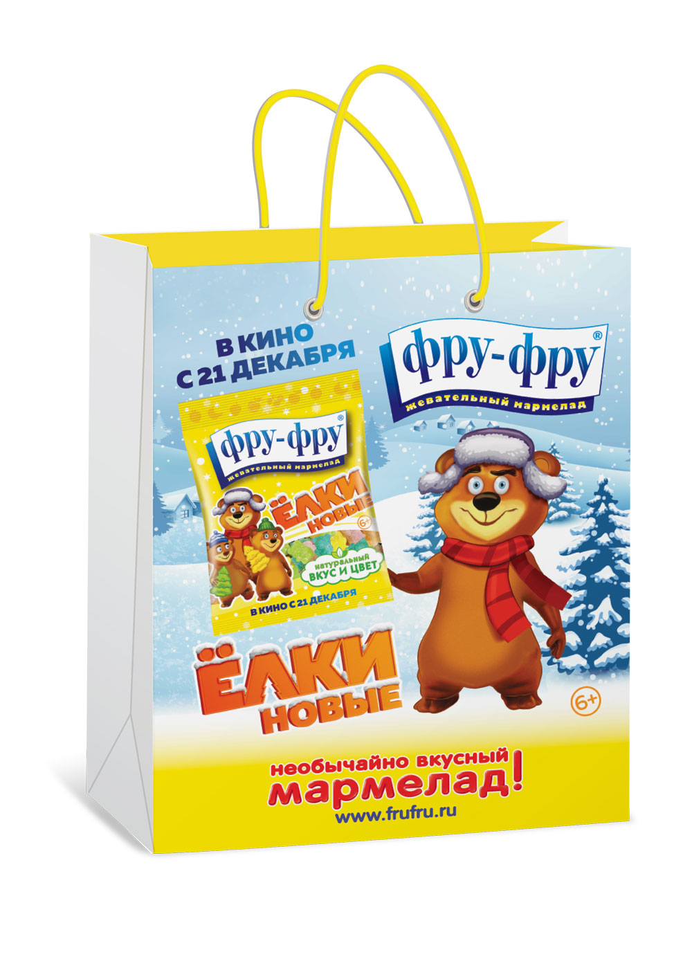 Дизайнерами ГК «Сладкая сказка» был разработан новый дизайн брендированных упаковок для мармелада. Поскольку «Ёлки новые» — новогодний фильм, то и дизайн выполнен в зимней тематике. Мишки и фрукты изображены в зимних шапочках, желтый фон упаковки расписан снежинками, а на фронтальной части пачек нанесены логотипы «Ёлки новые» и «Фру-Фру».