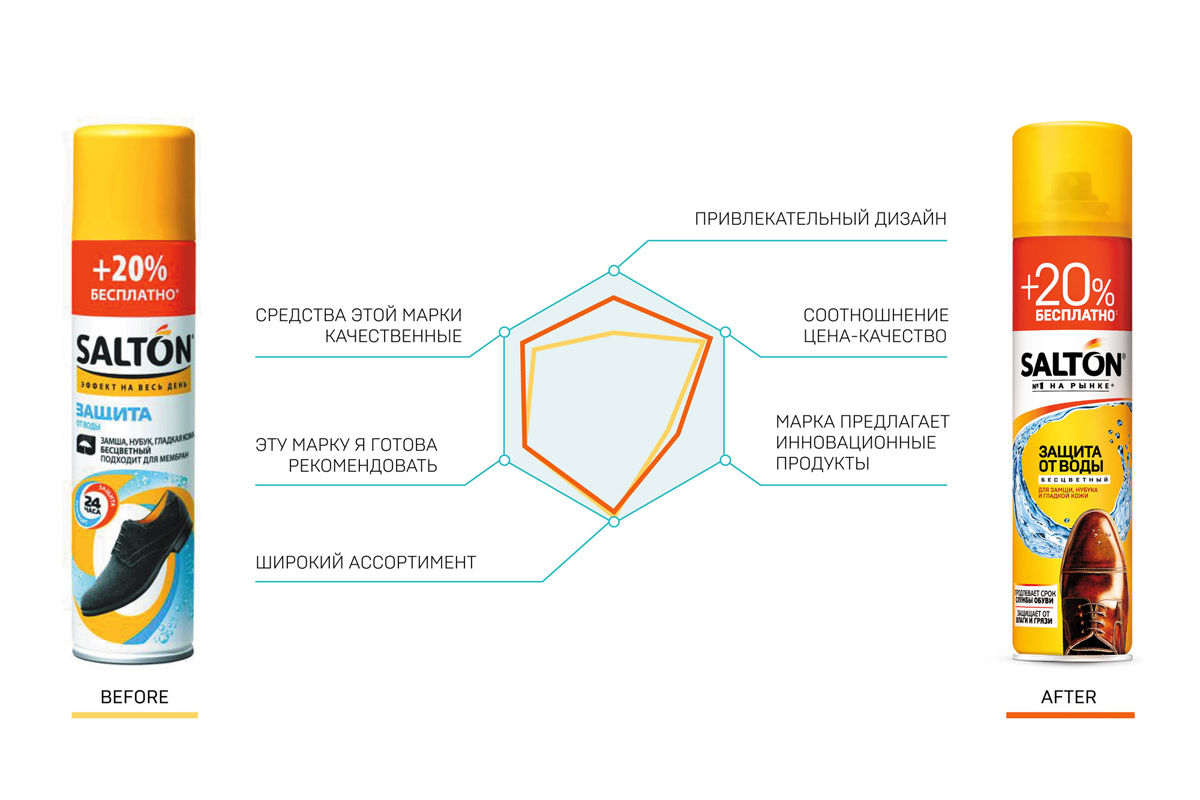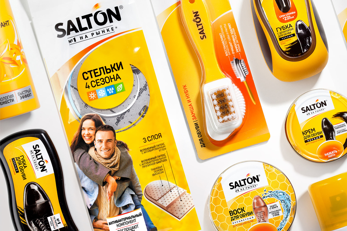 Новое шрифтовое начертание логотипа — более строгое и основательное, с динамичными полупрозрачными «перышками» над буквой «О». Доминирующий желто-оранжевый цвет обеспечивает хорошую заметность на полке. Все текстовые блоки — компактные и структурированные, для быстрого считывания информации потребителем. Ракурс обуви и визуальный стиль — inline с премиальной линейкой SALTON EXPERT, над рестайлингом которой наше агентство работало совсем недавно.
