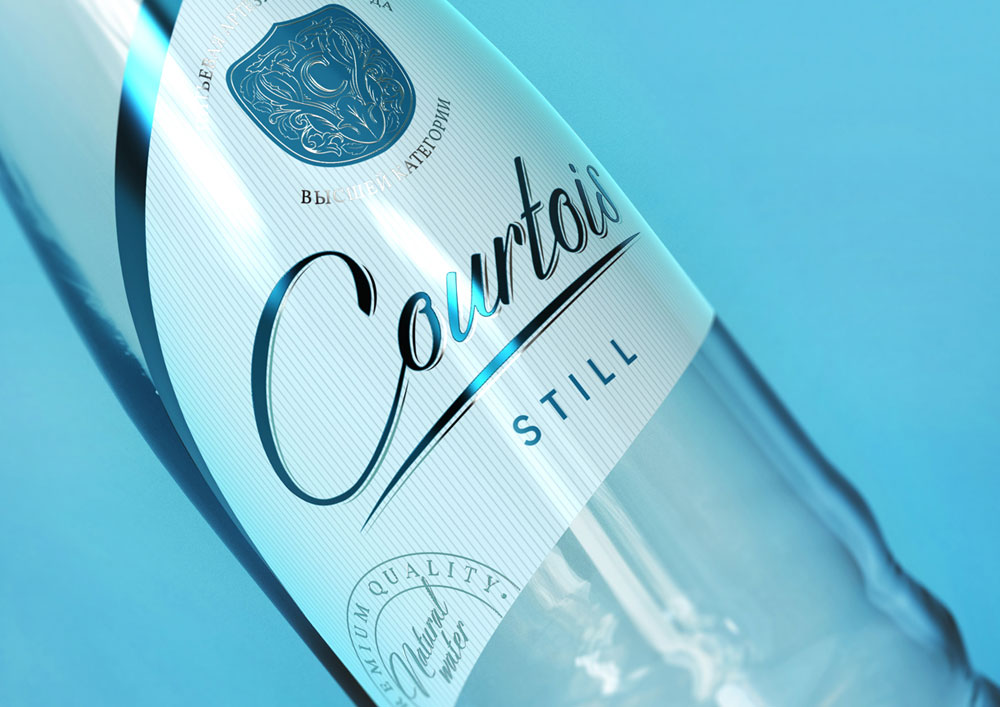 Courtois — это не просто вода, это средиземноморский ветер, свобода, здоровый образ жизни и кристальная чистота. Указание на высшую категорию воды, надписи Premium Quality и Natural Water подчеркивают премиальность продукта. Также логотип бренда состоит из написания и знака, выполненного в виде серебряного герба. Предусмотрена дифференциация цветными металлизированными полосами.
