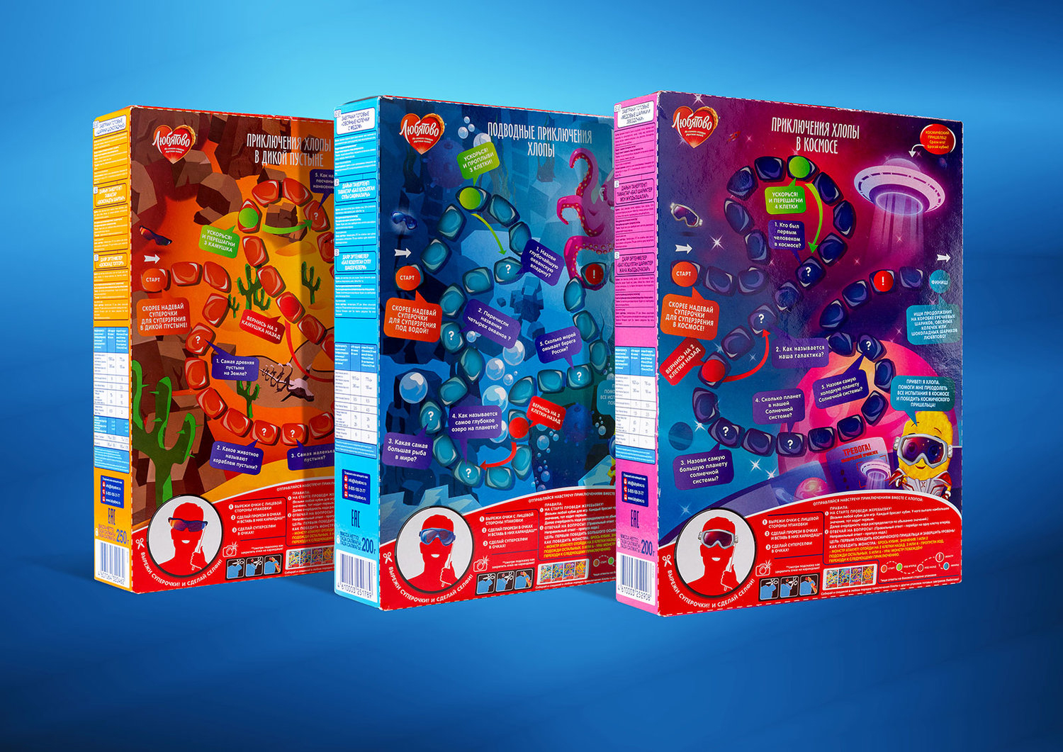 Первая часть нового позиционирования включает в себя три позиции: «Овсяные колечки с мёдом», «Шарики шоколадные» и «Медовые шарики и звёздочки». Главной задачей при разработке дизайна была увлекательная интерактивная составляющая. Как результат, каждая картонная упаковка содержит очки для суперселфи, которые можно вырезать для развлечения и фотографий, и карту для коллекционной игры с фантазийными мирами «Подводные приключения Хлопы». Хлопа Любятова — персонаж, хорошо знакомый покупателям. Её обновленный образ делает качественную продукцию компании ещё заметнее среди схожих позиций на полках супермаркетов.