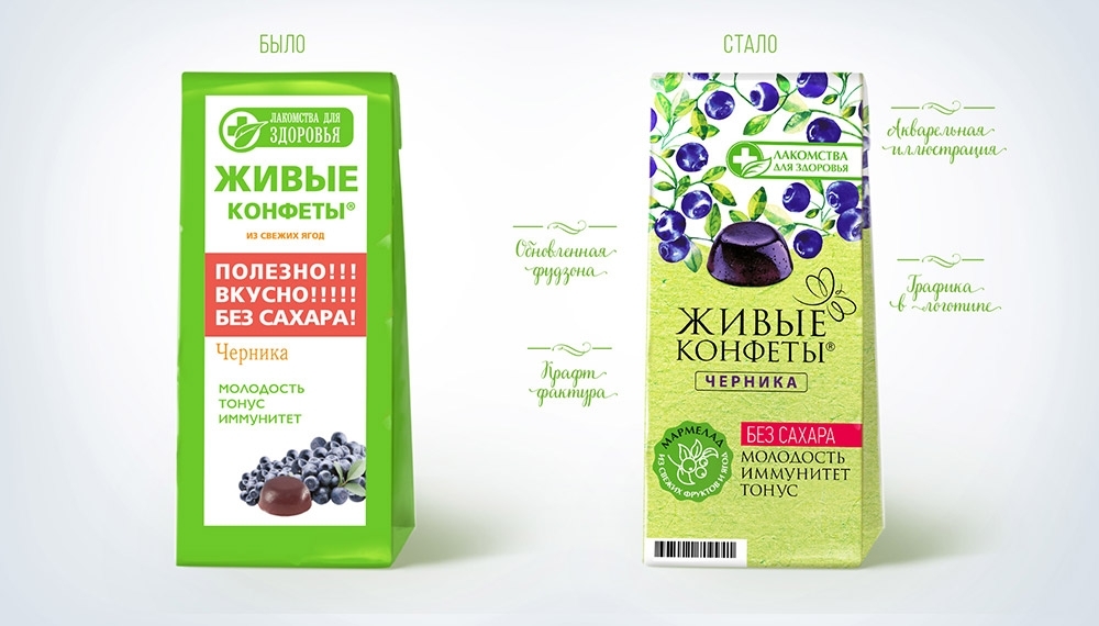 Живые конфеты это особенный продукт — у них исключительно натуральный состав и уникальная технология производства, позволяющая сохранить все полезные свойства ингредиентов, входящих в состав. Долгое время продукт продавался в аптеках, но позднее появился и в продуктовых магазинах. Поэтому возникла необходимость смены «медицинского» дизайна, на более соответствующий рынку.