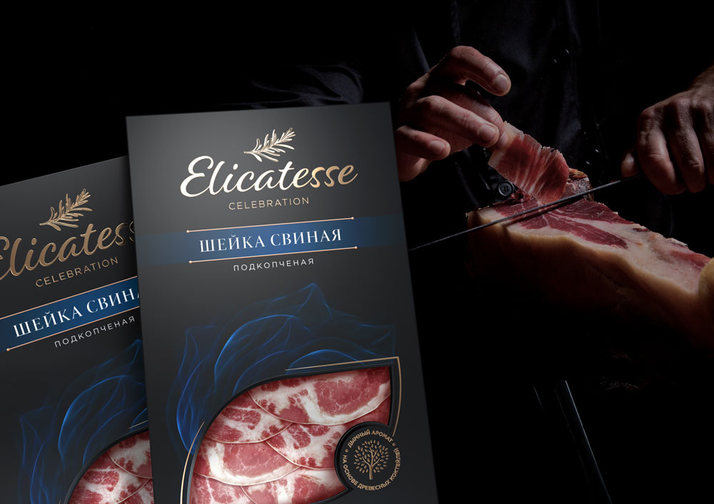 Для линейки Elicatesse была создана солидная упаковка в едином стиле: темные сдержанные тона, золотое тиснение. Цветовой акцент указывает на сорт деликатеса. В качестве визуализации изысканного копченого вкуса продукта выступает иллюстрация дыма вокруг окна для демонстрации мясного изделия. Данное решение выделяет ассортимент Elicatesse на полке магазина, подчеркивая его исключительность.