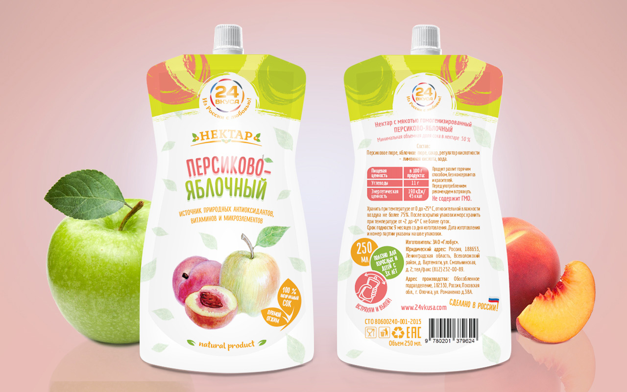 Так как продукция, выпускаемая под торговой маркой «24 вкуса», является исключительно натуральным продуктом прямого отжима, без концентратов, было решено выполнить дизайн в светлой цветовой гамме, дабы не нагружать композицию сторонними элементами.