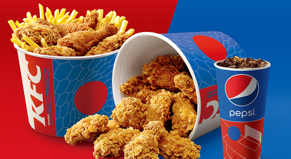 «Перед командой было поставлено несколько основных задач, — рассказывает арт-директор проекта Никита Иванов. — Во-первых, необходимо было синхронизировать фирменную стилистику бренда с брендом Pepsi. Во-вторых — подготовить брендированную упаковку для креативной идеи «11x11»: 11 стрипсов и 11 куриных крыльев в одном баскете. Отличная, кстати, идея: и с числом игроков футбольной команды перекликается, и с «11 травами» фирменного рецепта. Нам удалось комплексно решить обе задачи: объединить бренды общей графикой, сохранив при этом идентичность обоих, и органично вписать их в придуманную нами «футбольную» стилистику. Кроме того, в рамках проекта мы разработали несколько упаковок для продуктов «ограниченной серии», дизайн стакана для напитков, упаковку для сервиса доставки KFC и упаковку нового для сети продукта — хот-дога».