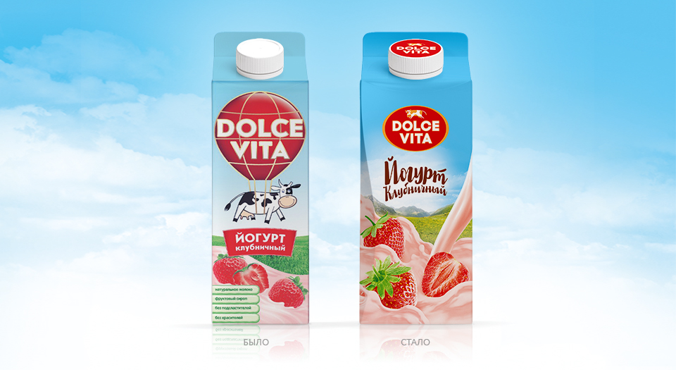 Основная цель редизайна линейки Dolce Vita — увеличение узнаваемости локальной торговой марки. При этом очень важно было сохранить существующие позиции бренда: йогурты Dolce Vita обладают высокой потребительской лояльностью и хорошо узнаваемым территориальным визуальным кодом. Мы видоизменили логотип, из сложной визуальной структуры он превратился в более современный и легко читаемый.