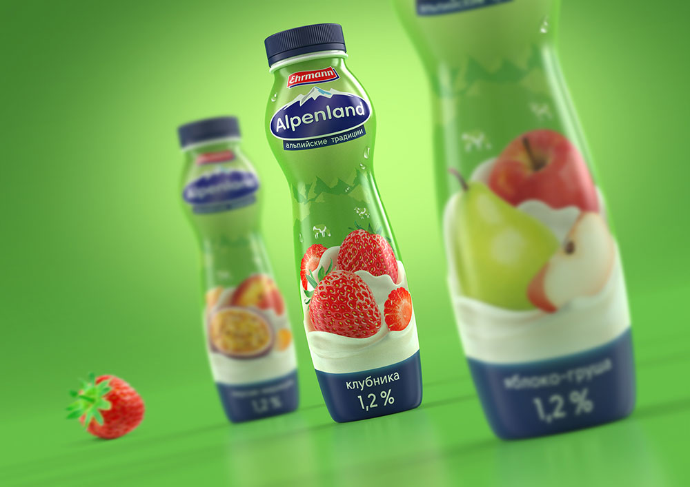 Расширение Alpenland — уже существующей линейки йогуртовых продуктов — до питьевого формата. Кроме того, не забываем о преемственности и узнаваемости. И вот, что получилось в итоге.