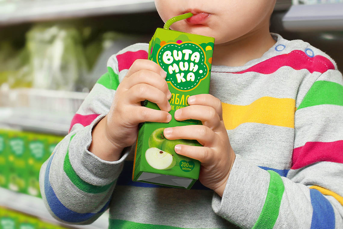 Форма бренд-зоны повторяет облачко из зелени на дереве, становясь частью его. Шрифт, созданный специально для «Витаминки», в котором отрисована каждая буква отдельно, отсылает к детскому творчеству, веселому и безопасному. «Наивные» графические элементы детской аппликации, простые и понятные формы, также отражают процесс развития, роста и детского творчества. Упаковка превращается в детскую поделку — нарисовали, вырезали, разместили, приклеили.
