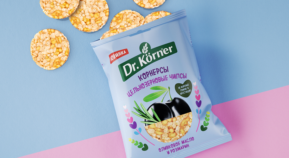 Появилась идея под брендом Dr. Körner вывести на рынок действительно полезные круглые мини-хлебцы, которая будет удобна для детских маленьких ручек. Агентство разработало позиционирование и платформу суббренда, создала новый логотип, нейм и дизайн упаковки новой линейки рисовых снеков на примере трех позиций: «банан», «яблоко» и «карамель», а также линейки снеков с шоколадом и йогуртом.
