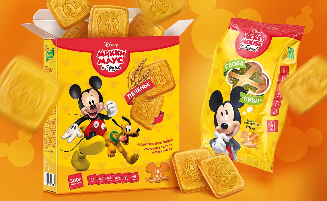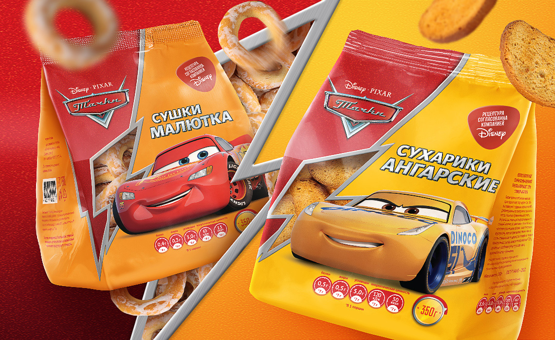 Необходимо было подобрать подходящего персонажа под конкретный продукт и придать упаковке свойственный мультфильму характер. В линейке хлебобулочных и кондитерских изделий три разных истории — Холодное сердце, Микки Маус и Тачки. Преемственность со стилем мультфильма сохранилась через цветовую гамму, шрифты и акцентные детали. Например, на упаковках сушек и сухариков «Тачки» обозначения свойств продукта превратились в иконки-спидометры, а окно в динамичную узнаваемую молнию.