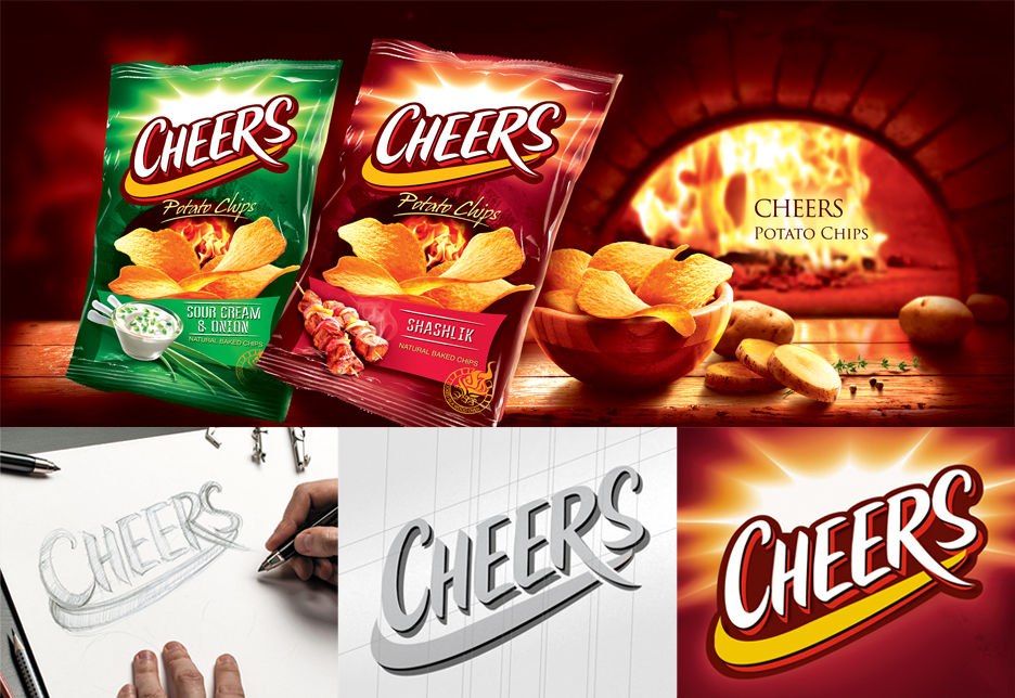 Эмоциональное поле бренда — легкость, молодость, яркие положительные эмоции и драйв отразилось в англоязычном транслитерируемом названии. «CHEERS» образовано от английского «ура», праздничного восклицания, аналогичного русскоязычному «ваше здоровье!». В фонетике нейма слышен заманчивый хруст любимого снека, моментально собирающего всю компанию насладиться теплом общения с друзьями и близкими