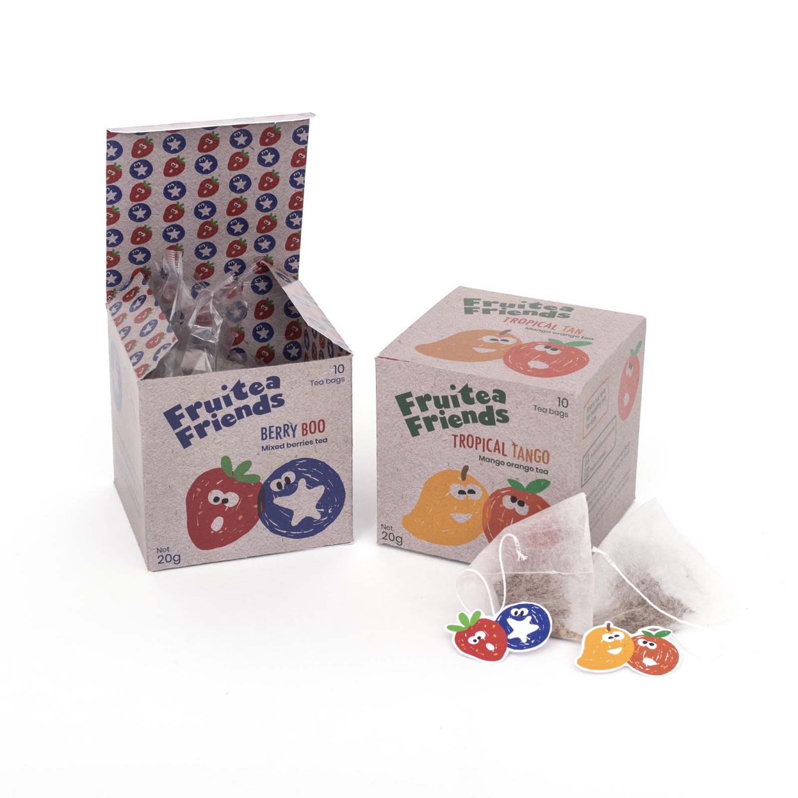 Вай Сан Ву (Wai San Woo) использовала забавных персонажей-фрукты для оформления упаковок с чаем для детей. Натуральный чай для детей не содержит танинов, кофеина, сахара и добавок. Только натуральные ингредиенты для детей всех возрастов. Милые персонажи и элементы в виде эскизов, наверняка, понравятся главной целевой аудитории продукта.