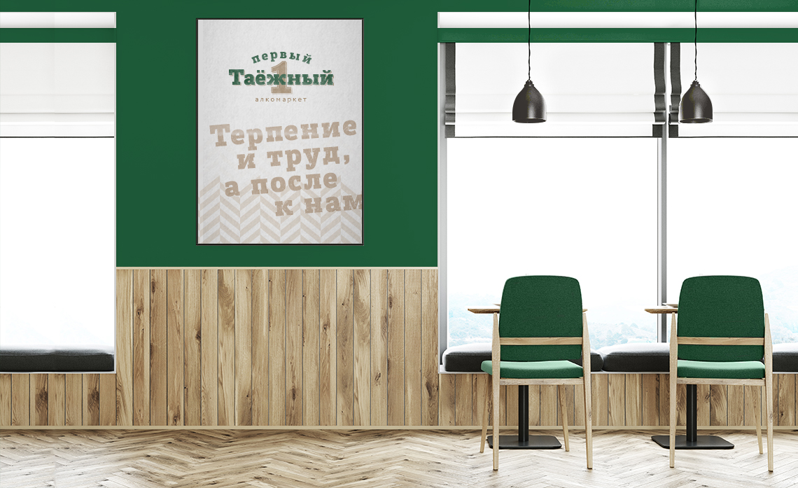 Дизайнеры поработали над названием и фирменным стилем алкомаркета с по-настоящему таёжной атмосферой — от натуральных древесных материалов в интерьере до лесных ароматов в магазине. У магазина широкий ассортимент как разливного и бутылочного пива, так и крепкого алкоголя. Также алкомаркет отличался не только интерьером и выбором напитков, но и тщательным отбором продуктов для продажи и заранее продуманным сервисом, которым редко могут похвастаться магазины алкоголя. Алкомаркету требовалось название и визуальная идентификация, которые поддержат и усилят «натуральный уверенный» образ.