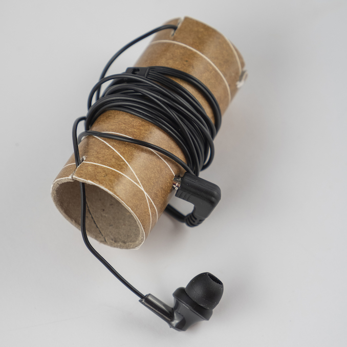 Задачей студента канадского Vancouver Island University было создать экологичный дизайн, в котором использовалось бы меньше материалов. В итоге получилась упаковка, в которой использован картон вместо пластика, а часть упаковки можно будет применить повторно. Для решения традиционной проблемы запутывающихся проводов от наушников, была придумана конструкция в виде картонной тубы, на которую и накручивается провод.
