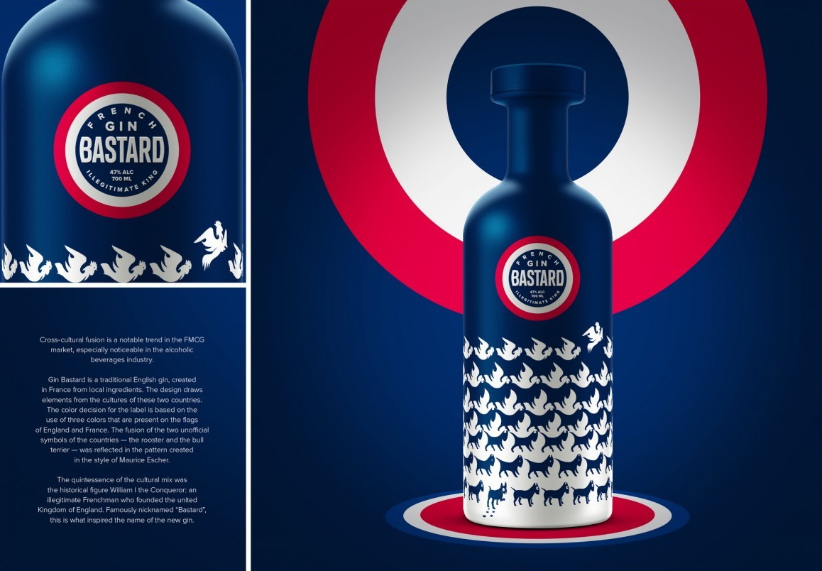 French gin Bastard — традиционный английский джин, созданный во Франции. Дизайн объединил в себе элементы культур этих двух стран. Цветовое решение этикетки строится на использовании трех цветов, присутствующих на флагах Англии и Франции. Слияние двух неофициальных символов стран — петуха и бульдога, получило отражение в паттерне, выполненном в стиле Маурица Эшера.