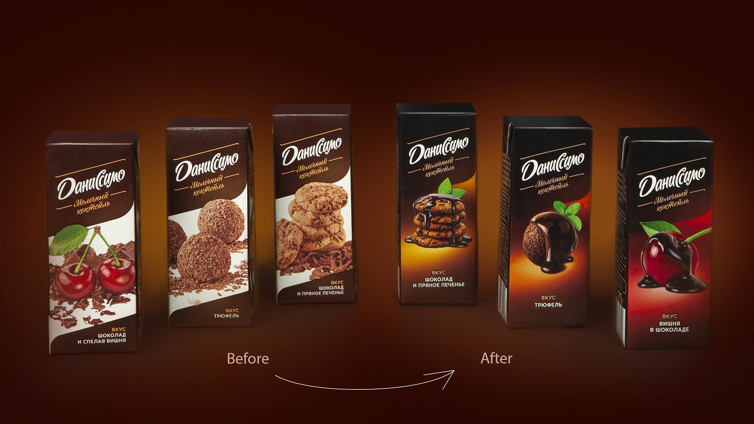 Линейка молочных коктейлей «Даниссимо» появилась на белорусском рынке в мае 2017-го и спустя всего два месяца заняла лидирующую позицию в своем сегменте. Несмотря на успех, компания приняла решение обновить дизайн упаковки, чтобы еще больше подчеркнуть изысканный характер лакомства. Также существовала необходимость усилить вкусовую дифференциацию внутри линейки.