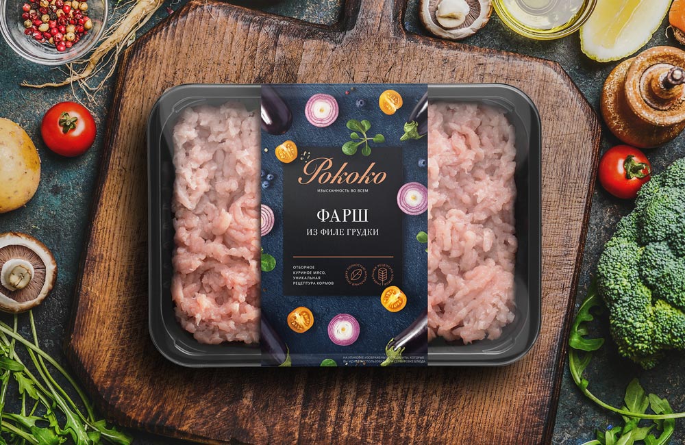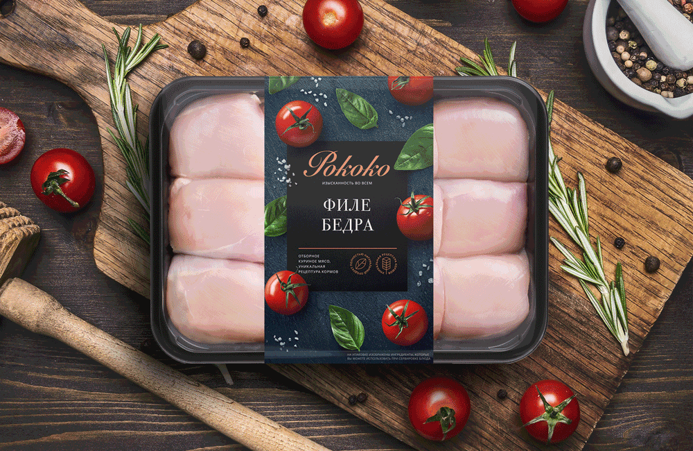 Отказавшись от прежних элементов логотипа, дизайнеры смогли сконцентрироваться на ключевом УТП: «Рококо» — это не просто качественный куриный продукт, это изысканность в приготовлении. При этом им удалось совместить оригинальный курсивный шрифт и минимализм. Так была сохранена узнаваемость для уже существующих лояльных покупателей и в то же время дали бренду возможность разговаривать на языке современного человека и отвечать его потребностям качества и удобства покупки. Вся важная информация лаконично представлена на лицевой стороне, продавая продукт буквально за секунды чтения.