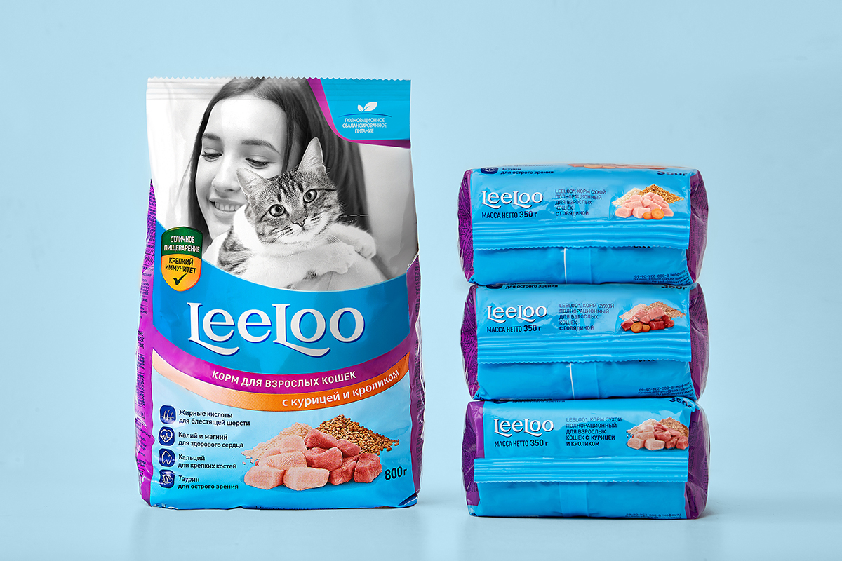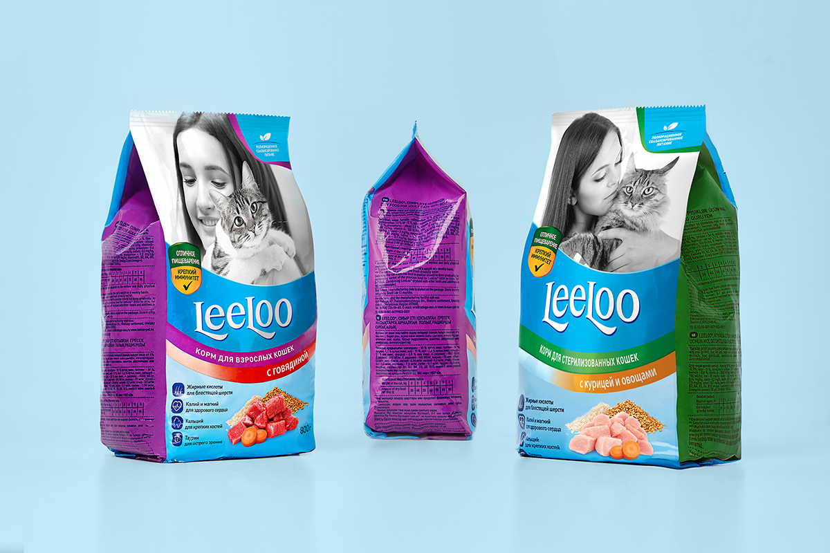 Появление животных на пачках — весьма распространенное решение для этого сегмента. Чтобы выделить продукт на полке, дизайнеры из Fabula Branding поместили в центр восприятия упаковки не просто изображение кота, а фотографию питомца с хозяйкой. Ее забота и нежность передают характер LeeLoo. Поддерживают этот эмоциональный образ пластичные формы в композиции и цветовая гамма с невысокой контрастностью.