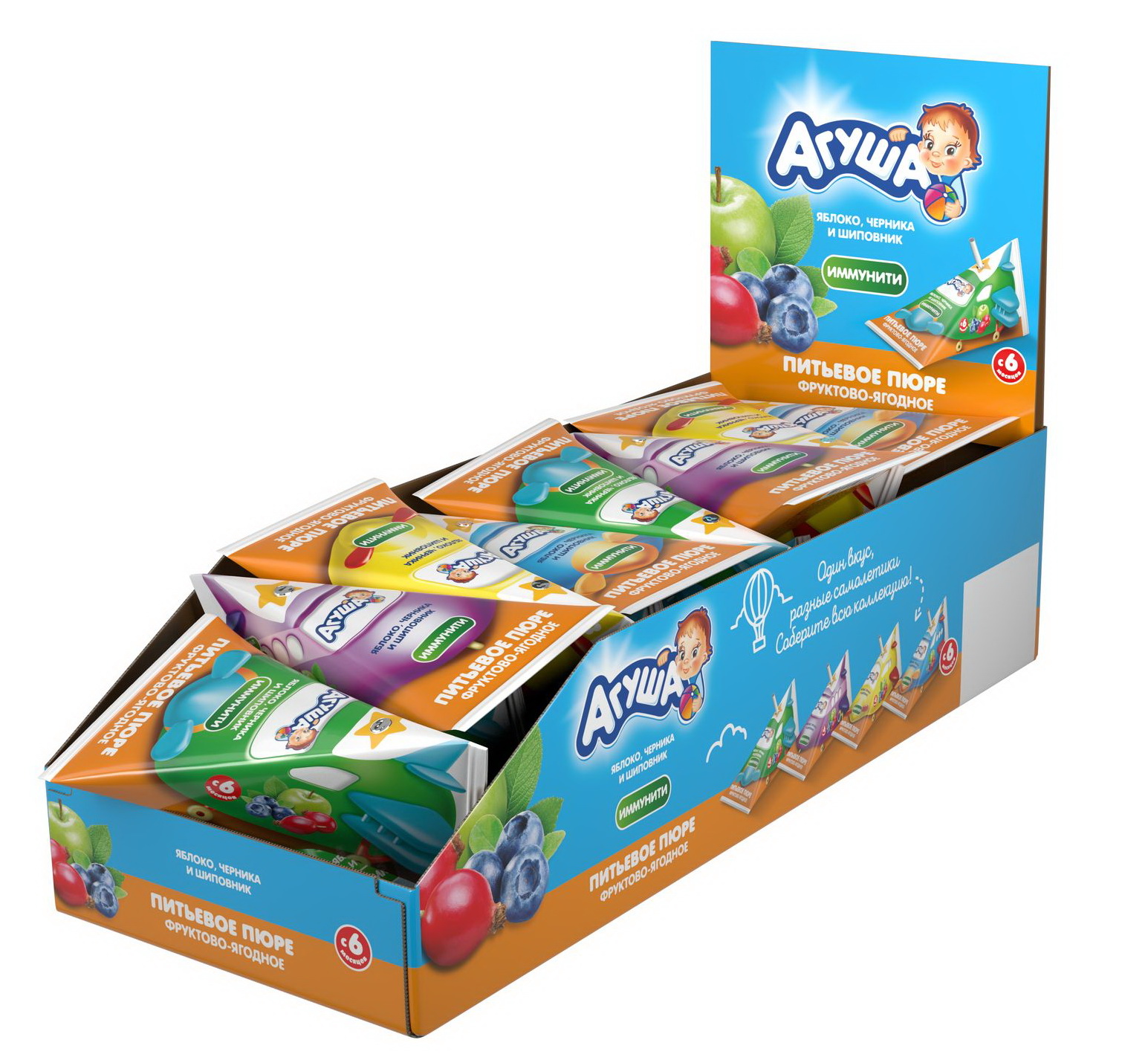 В настоящее время питьевое пюре «Агуша» в упаковке Tetra Classic® Aseptic представлено в ассортименте из трех наименований — «Яблоко, клубника, земляника и клюква», «Яблоко, черника и шиповник» и «Яблоко, черная смородина и ежевика». Продукт, предназначенный для детей старше 6 месяцев, обогащен витаминами В6 и В12, необходимыми для укрепления детского иммунитета.