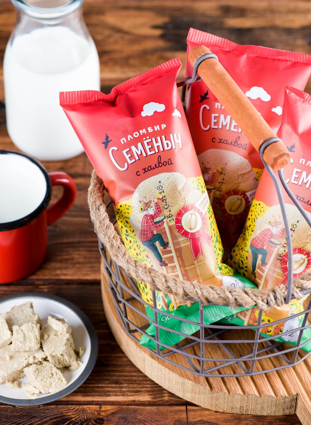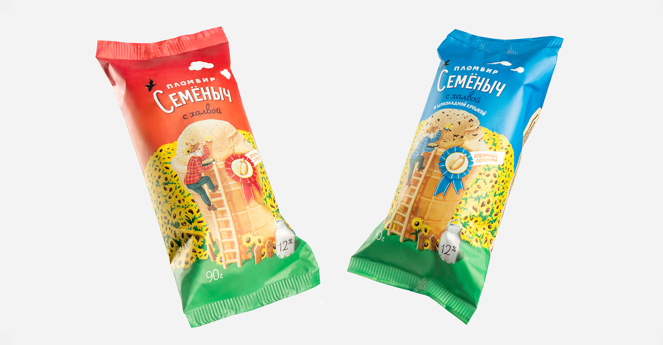 В случае с пломбиром «Семёныч» продукция была использована как часть иллюстрации. Таким образом был создан не только удачный образ, но и рассказ о том, что ждёт покупателя внутри непрозрачной упаковки.