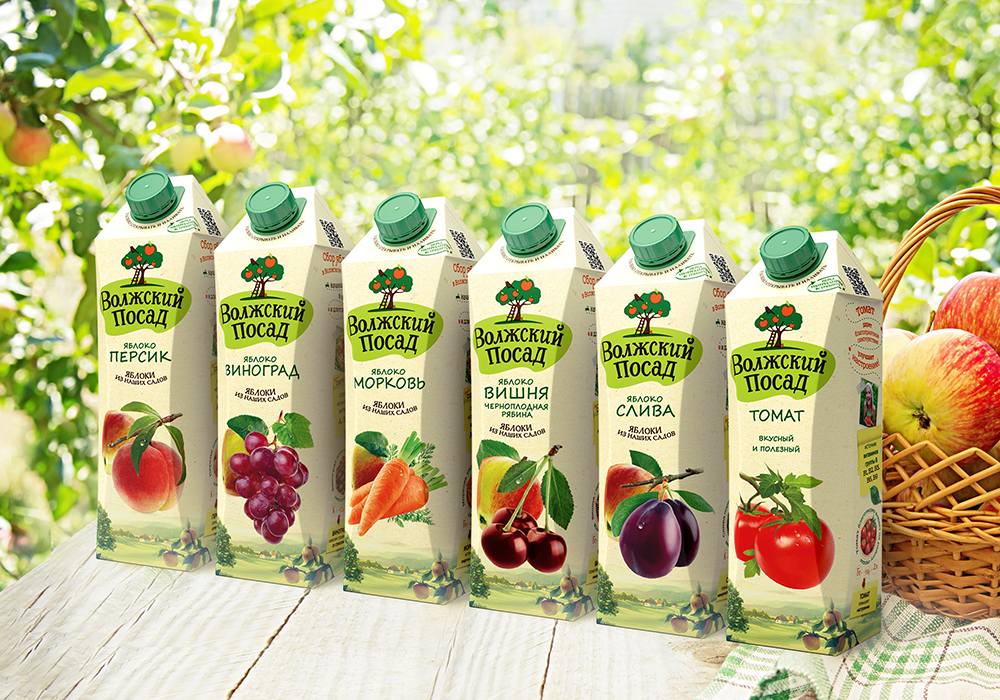 Задача дизайнеров состояла в создании бренда с нуля для премиальных соков с шестью различными вкусами, в каждый из который добавлен яблочный сок. Все элементы упаковки, в том числе и ее оборотная сторона, иллюстрируют главное конкурентное преимущество «Волжского Посада», выраженное в слогане «яблоки из наших садов».