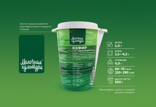 Дизайнеры выделили логотип «Молочной Культуры», разместив его на цветной плашке, ставшей охранным полем логотипа. Таким образом решили проблему считываемости названия марки на упаковке всех видов продукции. Ранее логотип терялся на иллюстративно-информационном фоне, у которого не было единой линии оформления для разных продуктов, вследствие чего отсутствовал четкий идентификатор бренда. Теперь на любой упаковке сразу считывается, что это продукт «Молочной культуры».