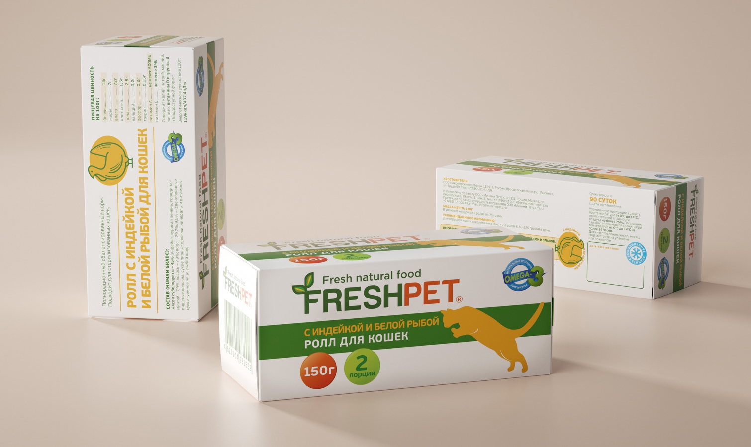 Минимализм в дизайне позволил четко выделить важную для владельцев животных информацию о корме. Простая и понятная упаковка позволяет быстро найти корм FRESHPET для кошек среди других продуктов, выпускаемых под брендом MINIME.