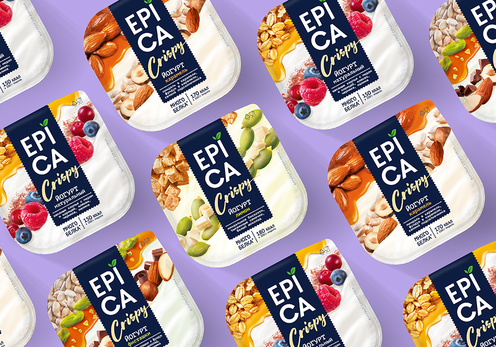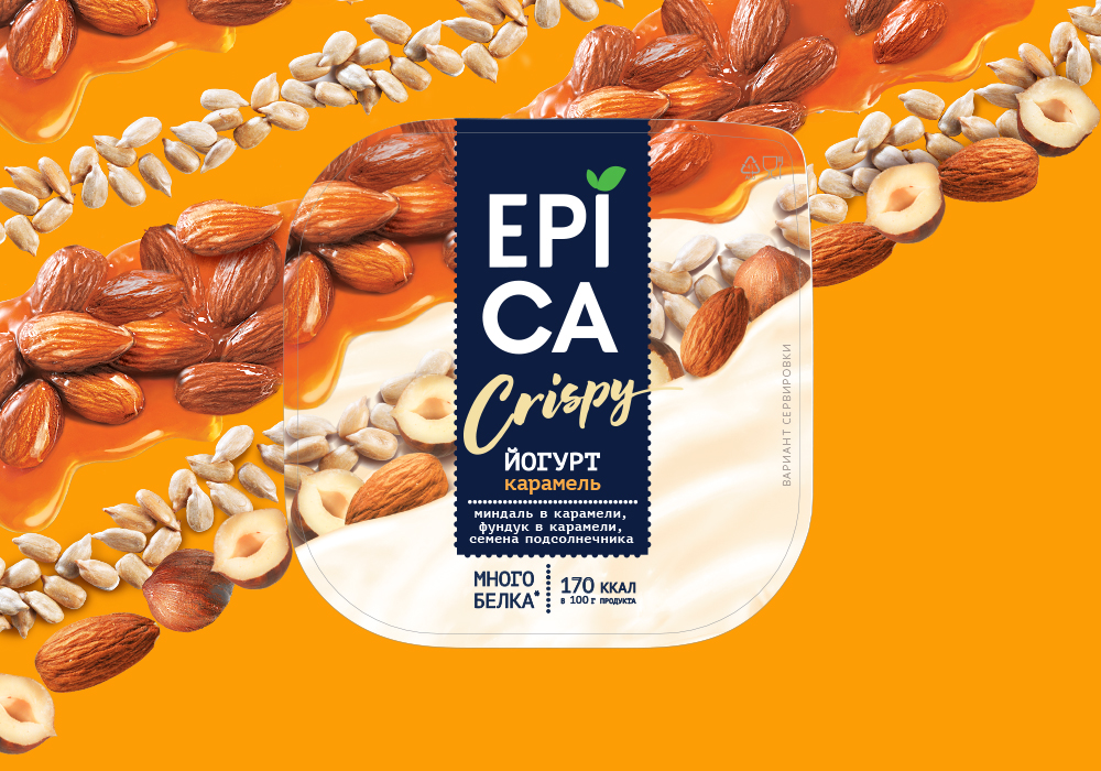 Хрустящая гранола — идеальный завтрак и кладезь витаминов! А густой йогурт с высоким содержанием белка — отличное дополнение. Это не секрет для миллионов людей во всем мире, которые заправляют хрустящие завтраки йогуртом. Эта распространенная полезная привычка дала идею для создания продукта 2 в 1 под брендом Epica, которого еще нет на российском рынке — флип-йогурта с насыпкой из кранча. Дизайнеры должны были сохранить преемственность и узнаваемость бренда Epica, сделав фокус на хрустящей составляющей продукта и его функционале.