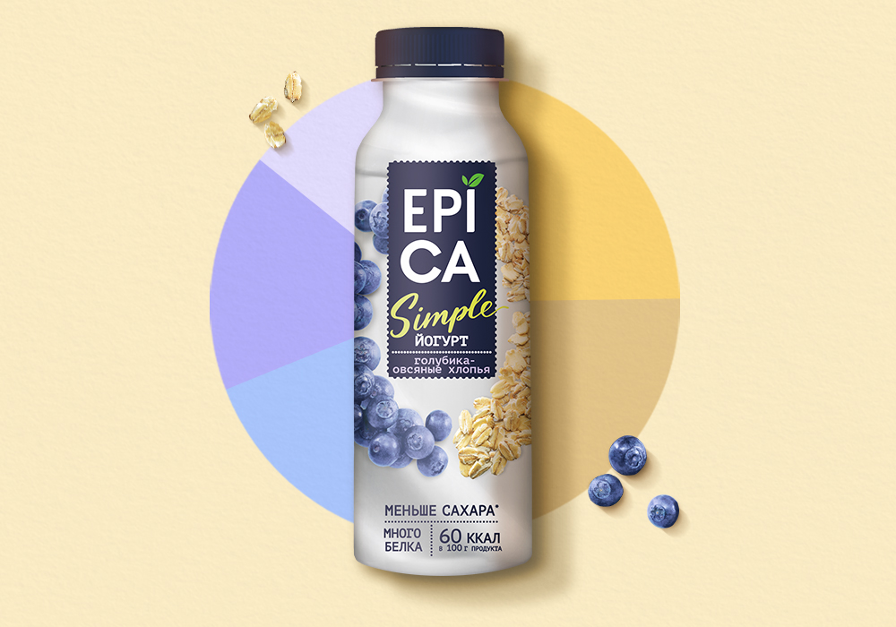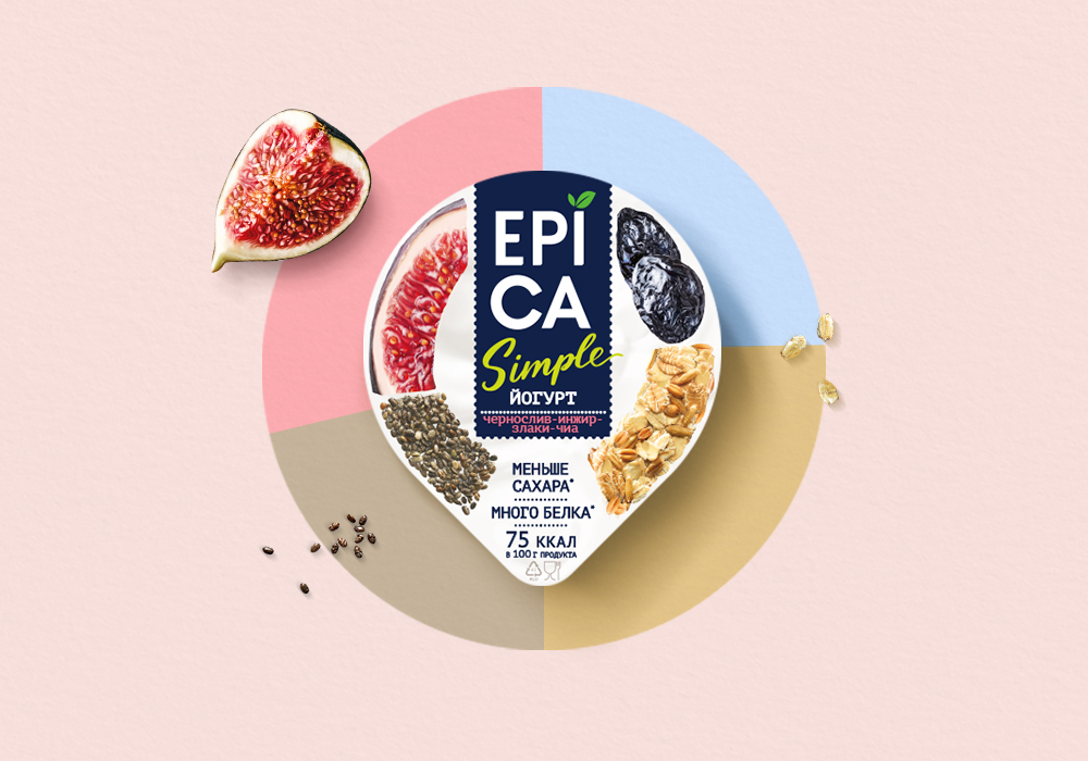 В дизайне легко считывается фирменная стилистика Epica, но на первый план выходит фудзона в виде круговой диаграммы, которая складывается из фруктов, овощей и других продуктов, входящих в состав каждого йогурта. Выбор диаграммы как ключевого для саббренда символа позволяет продемонстрировать все добавки и подчеркнуть сам подхода к выбору продукта аудитории, у которой все рассчитано и разложено по полочкам.
