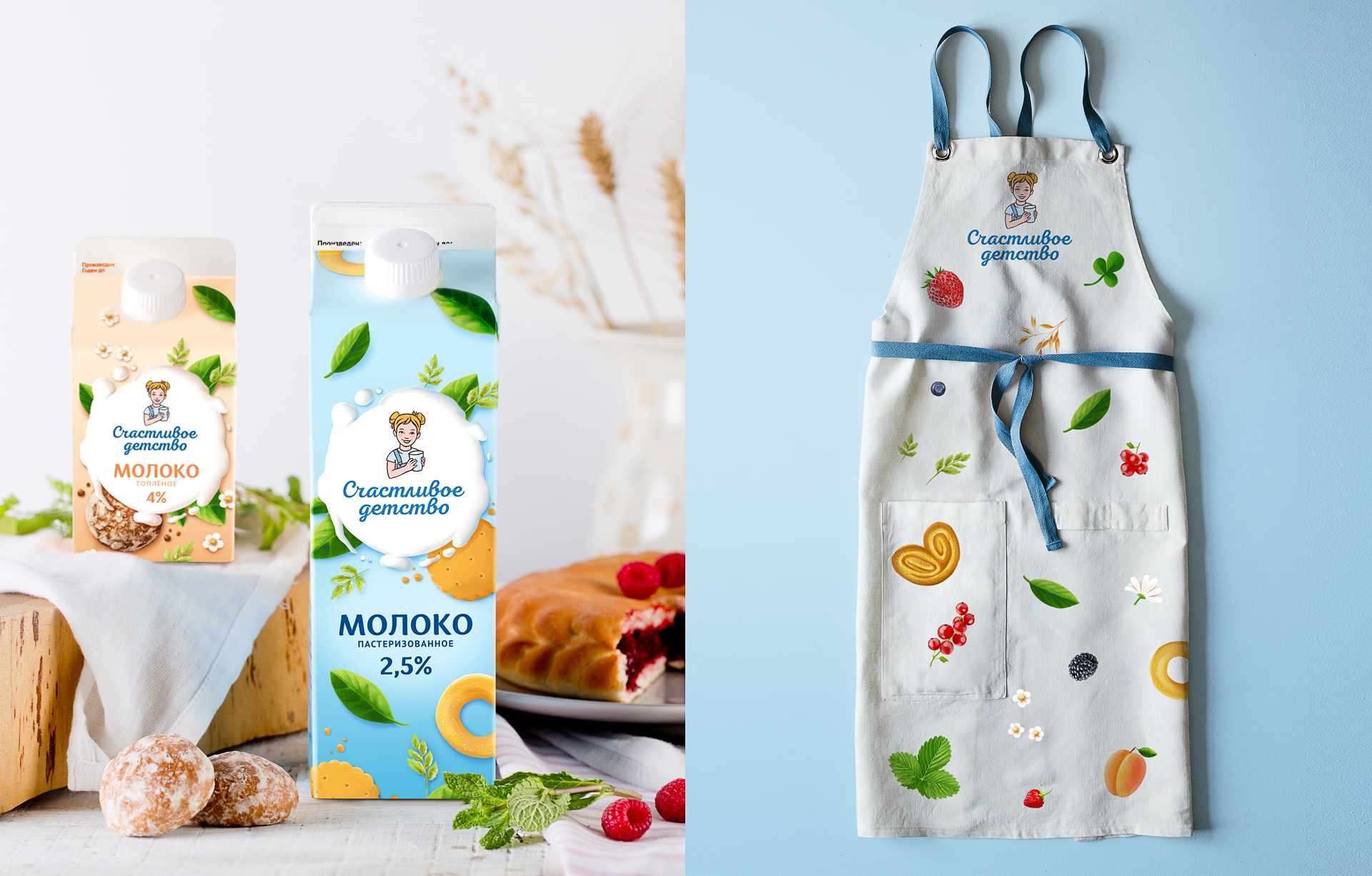 Нейминг и ключевое послание бренда «Счастливое детство начинается с молока» подчеркивают исключительную пользу и любимый с детства вкус свежего натурального продукта. В дизайне логотипа и дизайне упаковки использована авторская иллюстрация — девочка со стаканом молока как олицетворение образа счастливого детства, того самого, любимого с детства вкуса натурального молока.