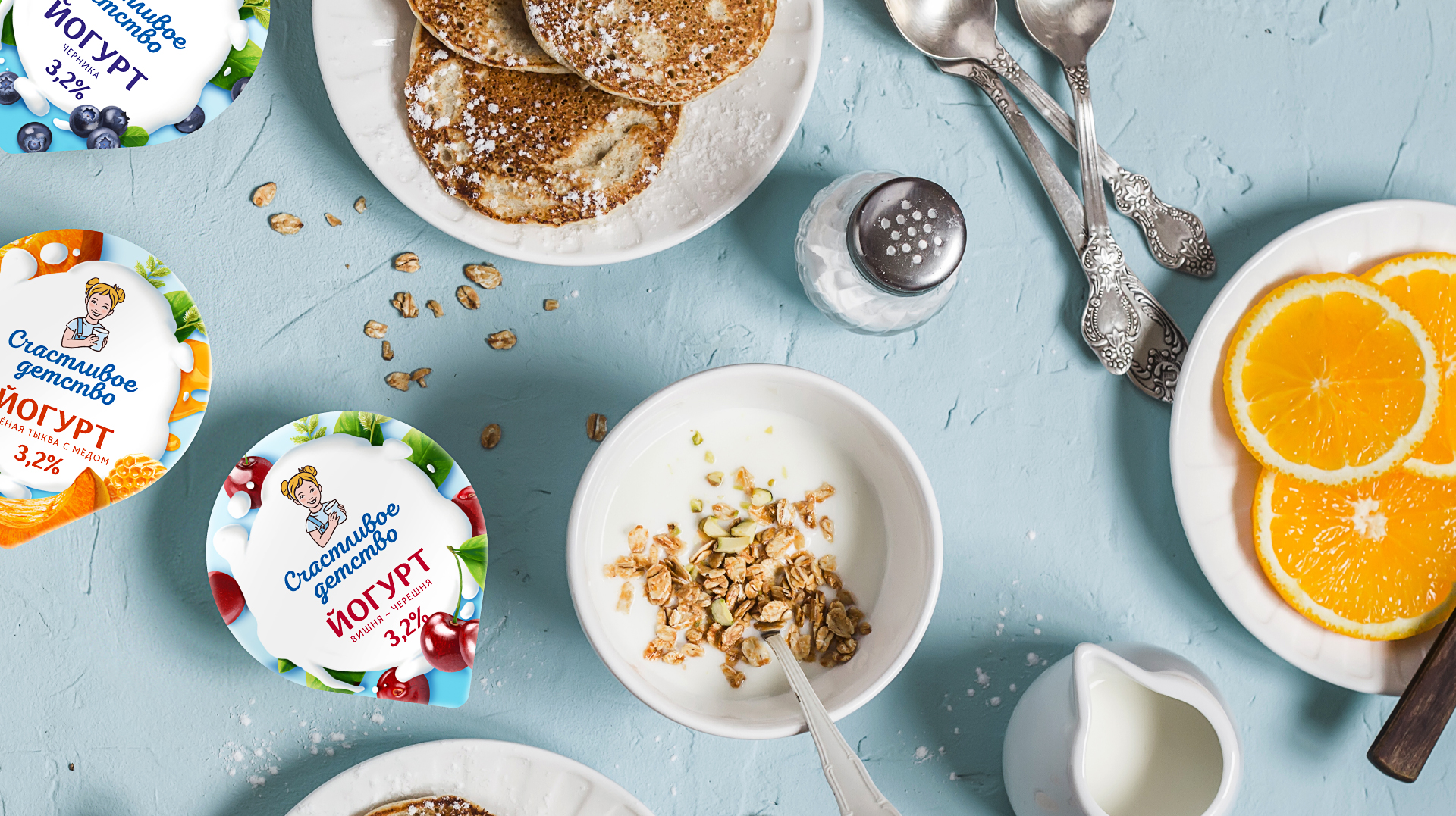 Дизайн упаковки всего ассортимента молочной продукции «Счастливое детство» раскрывает натуральность и свежесть продукта и формирует высокие ожидания от вкуса. Профессиональный фудстайлинг помогает раскрывать все преимущества натурального продукта и сформировать высокие ожидания от вкуса