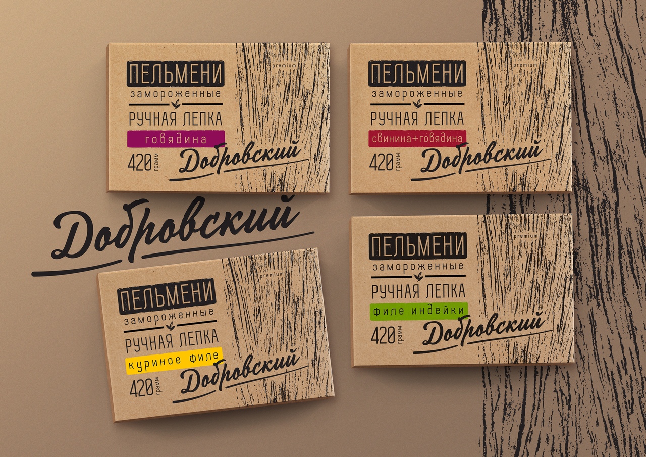 Еще один прием — использование текстуры дерева. Это отсылает к натуральности продукта и вызывает в памяти стойкий ассоциативный ряд с кухонными принадлежностями, которые часто используются для ручной лепки пельменей: скалка и разделочная доска.
