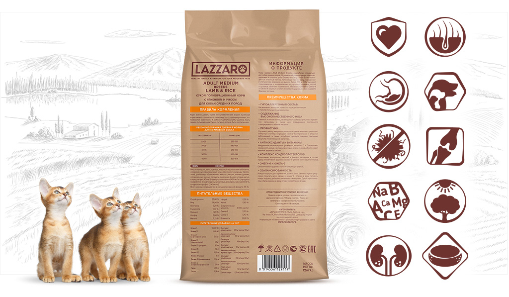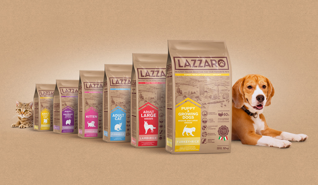 Корма для домашних животных LAZZARO, изготовленные в Италии, стали объектом брендирования агентства StyleYou. В задаче стояла необходимость разработать дизайн кормов для кошек и собак в сегменте средний-плюс, с четким пониманием итальянского происхождения кормов.