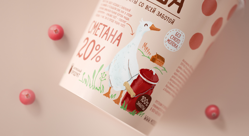 Кроме того, мы переработали предыдущее дизайн-решение в пользу категорийной цветовой кодировки: главенствующими цветами молочной линейки стали синий и голубой, кефира — оттенки зеленого, и так далее. А рисованный несимметричный паттерн добавляет упаковке простоты и привлекательности. Являясь сквозным элементом оформления упаковки всех линеек бренда, он же призван увеличить узнаваемость и идентификацию марки на полке. А клеймы на упаковке подтверждают натуральность молочных продуктов и подчеркивают «душевность» и стопроцентную заботу о качестве — и о потребителе, конечно же.