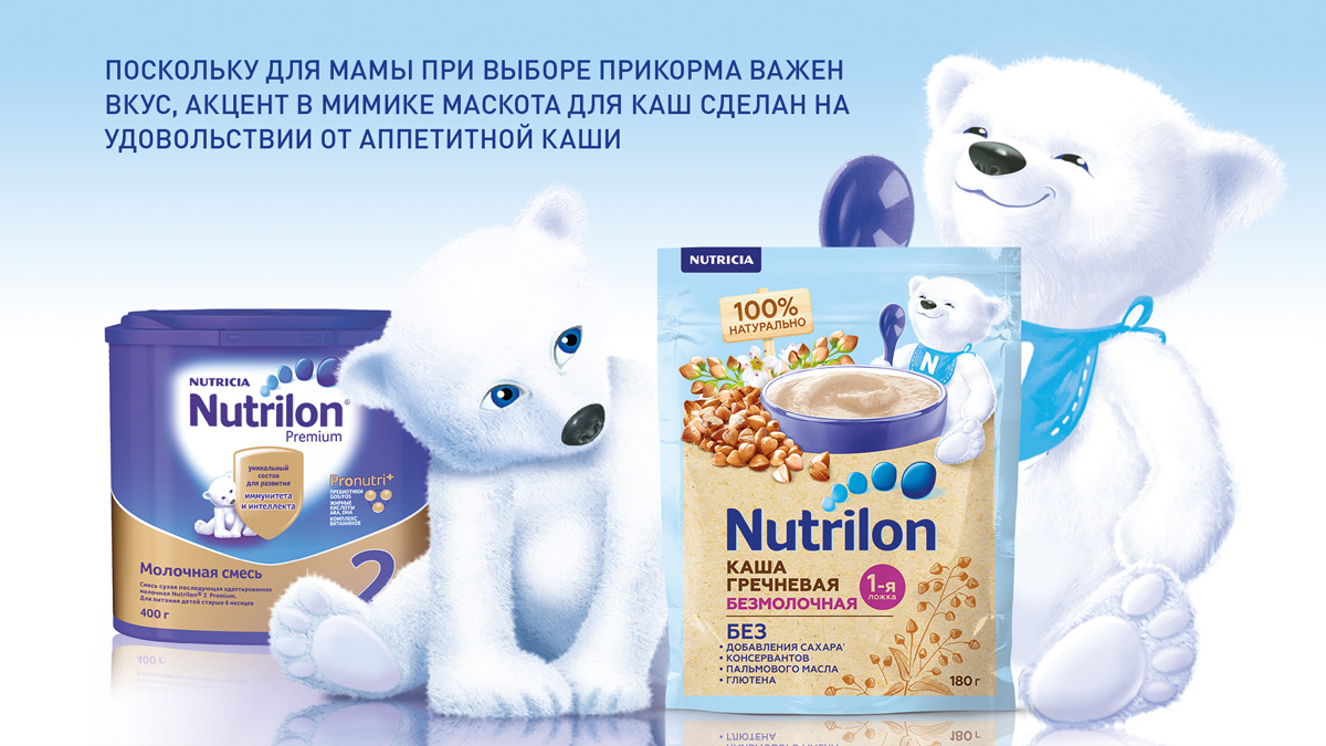 Главные изменения претерпел бренд-маскот. Медведь на упаковке каш Nutrilon совершенно не похож на медведя с упаковки смесей. Поскольку для любой мамы при выборе прикорма важен вкус, акцент в мимике маскота сделан на удовольствии от аппетитной каши.