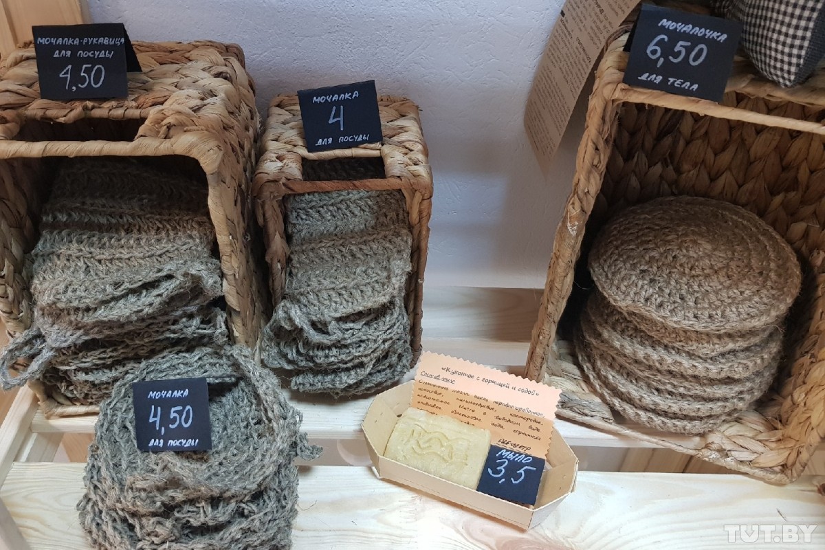 В основном на полках — альтернативные хозяйственные товары и предметы личной гигиены. Например, есть авоськи, торбы, фруктовки — многоразовые мешочки, рюкзак из бывшего баннера, мочалки из джута и губки для мытья посуды из натуральной ткани. Все товары прошли сертификацию.