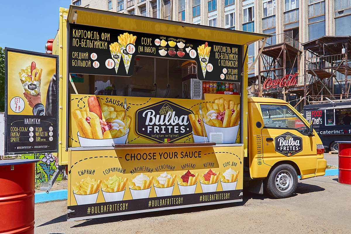 В основе разработанного дизайн-решения — акцентный логотип, делающий фудтрак и модуль заметными издалека. Для брендирования внешней части использованы лаконичные фуд-иллюстрации в стилистике быстрого скетча, рассказывающие о продукте. В качестве фирменных выбраны цвета бельгийского флага, что рассказывает о родине рецепта картофеля.