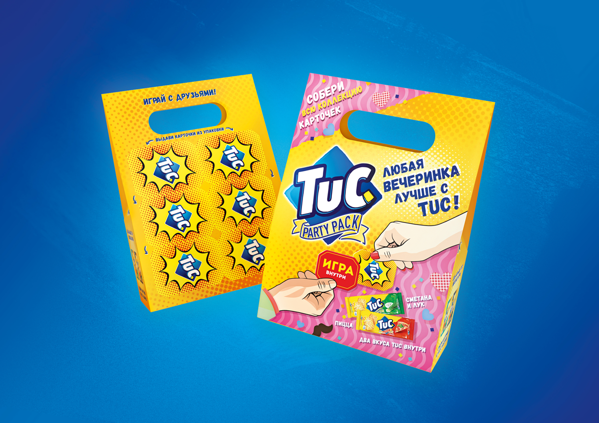 TUC — бренд снеков, ориентированный на молодежь, ведущую активный образ жизни. Летом 2019 года вышла лимитированная линейка TUC Party Pack — три набора, в каждом из которых две пачки крекеров и карточки для настольной игры. Купив все, можно собрать полную коллекцию из 18 карточек. Единый стиль линейки и индивидуальный дизайн упаковки создали в Yasno. branding agency.