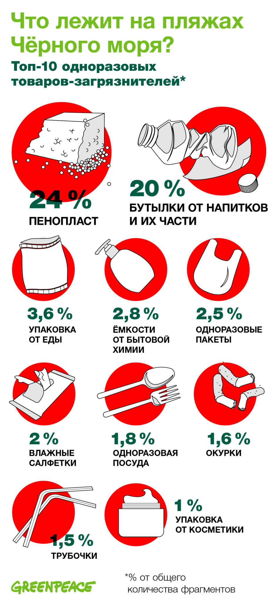 Бо́льшая часть найденного пластика — одноразовые товары и упаковка. На Чёрном море доля одноразового пластика доходит до 68%, на Азовском море — до 90%.
