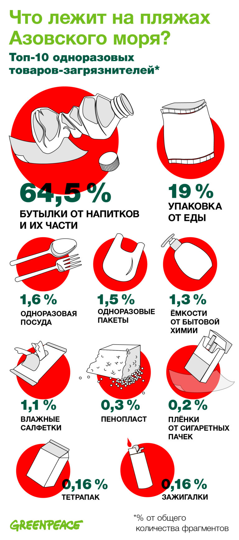 В ноябре 2018 года эксперты и волонтёры Greenpeace изучили, насколько сильно загрязнены пластиковым мусором побережья Чёрного и Азовского морей. На восьми стометровых участках пляжей они обнаружили 13 тысяч пластиковых фрагментов общим весом почти полтонны.