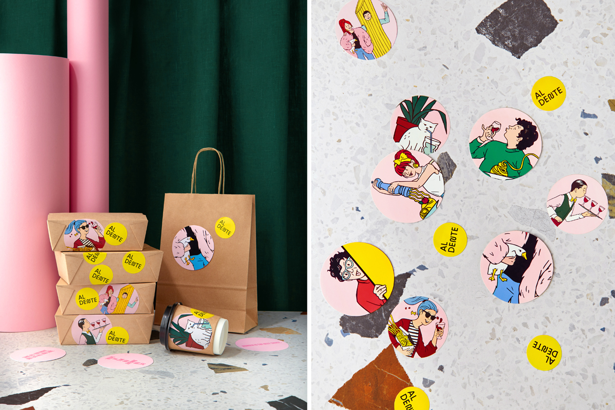 Почувствовать атмосферу Италии помогают авторские сюжетные иллюстрации в стилистике скетча. Расположенные в наиболее освещенных местах бистро и на входной группе, они привлекают внимание, при этом не перегружая посетителей информацией. Также иллюстрации можно увидеть в оформлении меню, упаковок для пиццы и пасты, стикерах и детских раскрасках — все точки контакта с брендом способствуют погружению в его пространство.