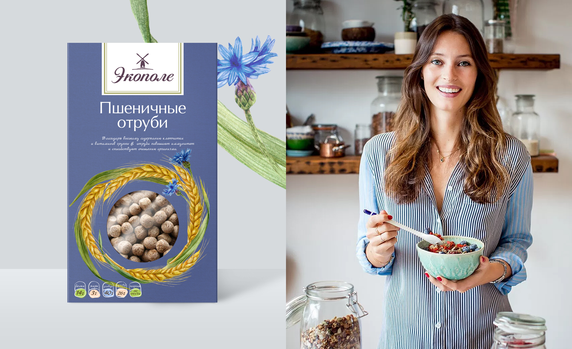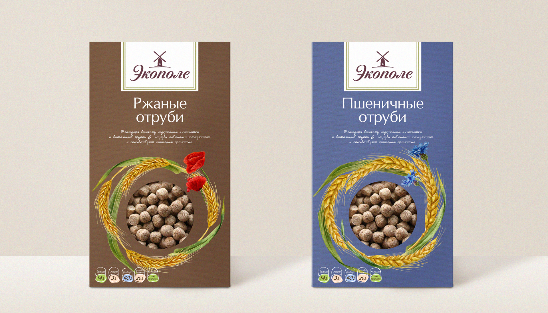 Под брендом «Экополе» представлен широкий ассортимент натуральных отрубей, пшеничных, овсяных, ржаных, кукурузных, позволяющих насыщать организм столь необходимой клетчаткой. В рамках проекта брендинга «Экополе» разработаны: нейминг, дизайн логотипа и фирменного стиля, а также дизайн упаковки всего ассортимента продукции.