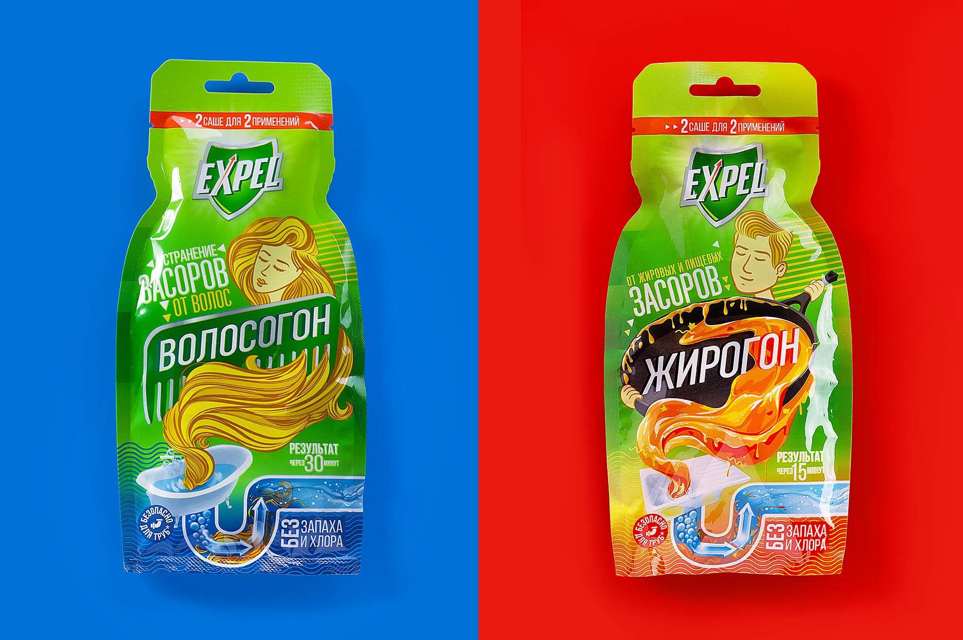 Вызов был принят. Разрабатывая упаковку для «Expel», дизайнеры задались вопросом: «Может ли чистка засоров в трубах выглядеть привлекательно?» Ответ: «Однозначно да!». Вдохновившись яркими трендовыми цветами, специалисты оформили упаковку так, чтобы она стала необычным решением для полок российских супермаркетов.