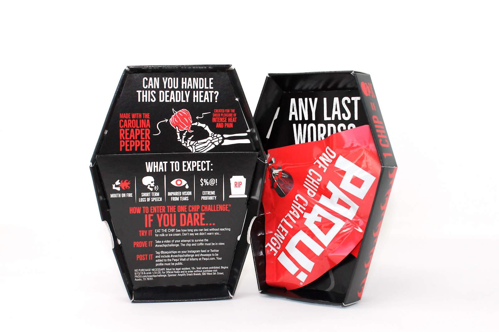 Американская компания Paqui Chips в этом году снова выпускает на рынок чипс #OneChipChallenge. На этот раз упаковка продукта ещё более зловеща, поскольку чипс ещё острее, чем в прошлом году. Новый, очень острый чипс выглядит так же устрашающе, как и ощущается на вкус. В этом году производитель предлагает чипс из синей кукурузы с большим количеством чёрной приправы, изготовленной из знаменитого перца Carolina Reaper Pepper, который зафиксирован в Книге рекордов Гиннесса, как самый острый чили-перец.