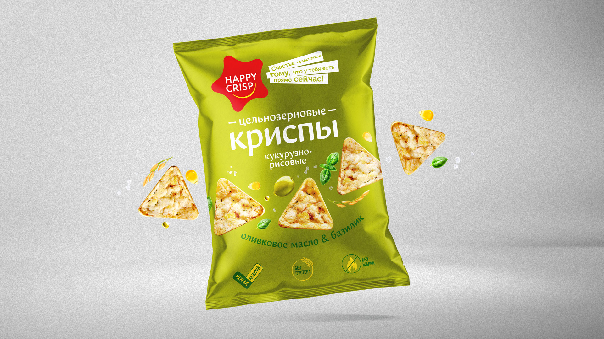 Объединяющей идеей, которая легла в платформу бренда Happy Food стала тема «маленьких мгновений счастья». Первым брендом в портфеле компании стали цельно зерновые чипсы Happy Crisp. Логотип в виде звезды вместе с эмоциональными текстами транслируют идею счастья, заложенную в платформе бренда.